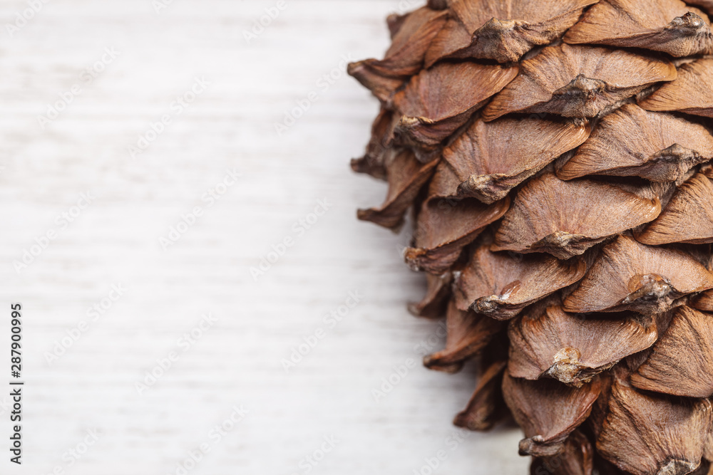 Cones of Siberian cedar pine on light background with copy space. Studio shot, close-up.