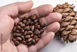 Pine nuts in palm of man. Siberian pine cones on white surface. Close-up, studio shot.