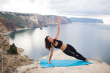 Beautiful slim woman practices yoga and pilates on the cliff of mountain with the sea view.