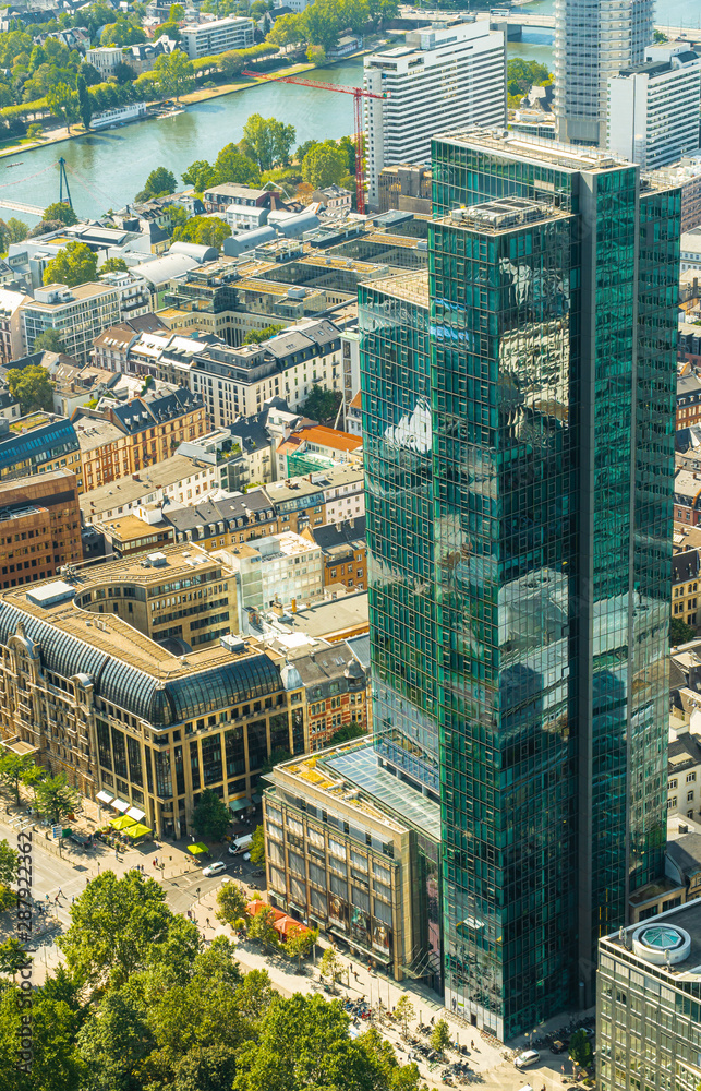 Panorama miasta z lotu ptaka. Frankfurt nad Menem widziana z gory. Panorama miasta w Niemczech. Widok na rzeke. Zabudowa nad Menem.