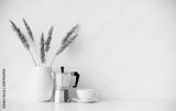 White home decor, coffee maker, ceramic vase and cup on tabletop, contemporary interior