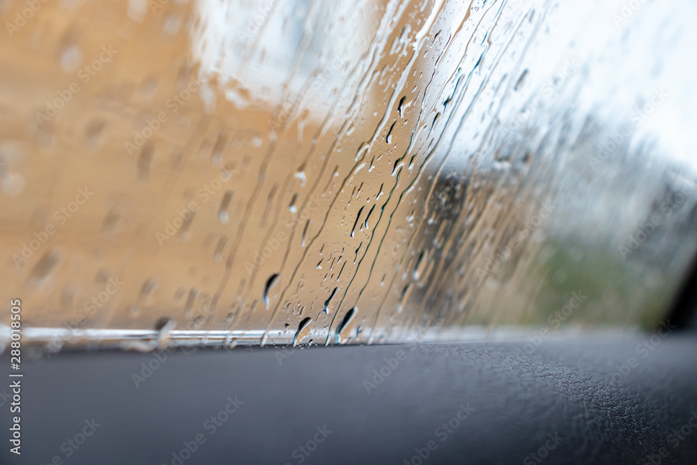 Rain drops on car glass in rainy day, summer is over and autumn fall storms and bad weather comes