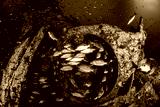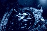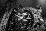 Schools of colorful tropical fish around an old underwater shipwreck in a tropical ocean