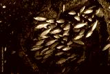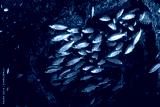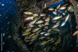 Schools of colorful tropical fish around an old underwater shipwreck in a tropical ocean