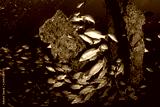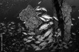 Schools of colorful tropical fish around an old underwater shipwreck in a tropical ocean