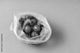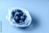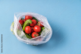 Cucumbers and tomatoes in plastic bag on blue background. Stop using artificial food storage bag.