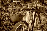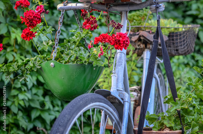 Old vintage bicycle decorated with flowers and green plants. Close up,