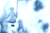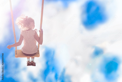 little girl riding on a swing against a blue sky, bright sunshine and glare, white clouds