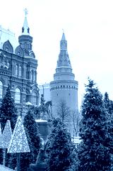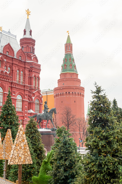 monument to Marshal Zhukov on the background of the Kremlin in Moscow in winter, Christmas trees, seldane historical Museum