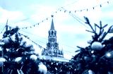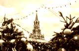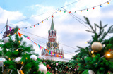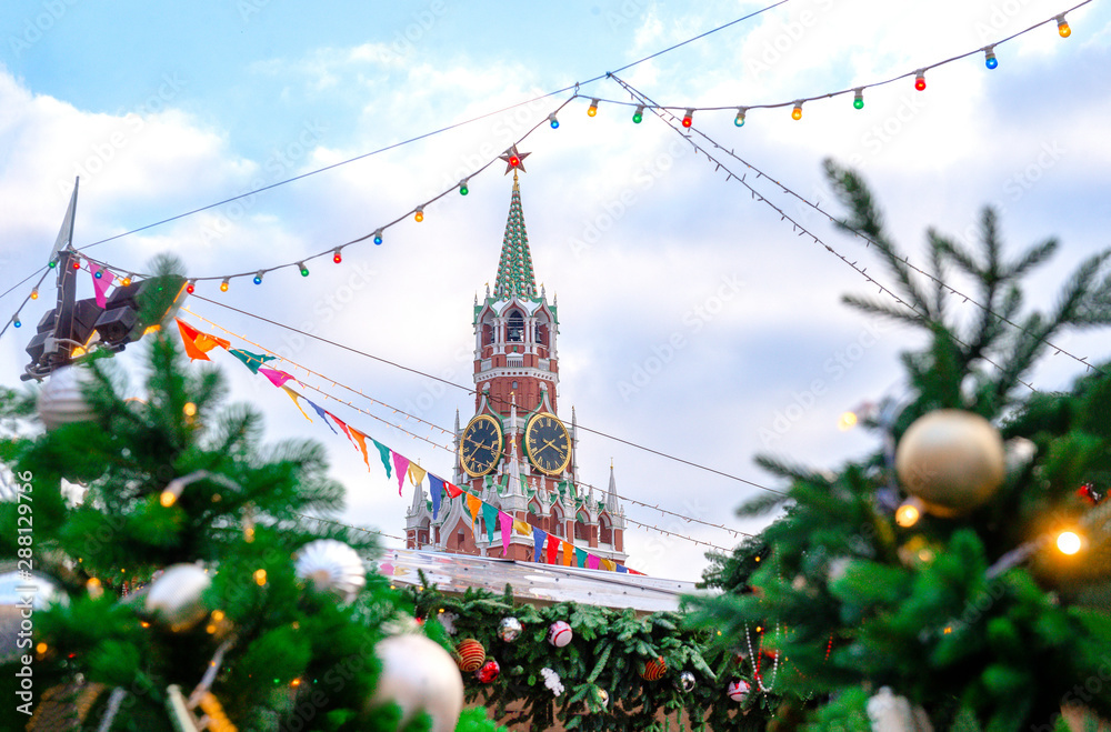 Christmas fair on red square in Moscow, Kremlin tower, spruce decorated with balls, Christmas tree, new year,