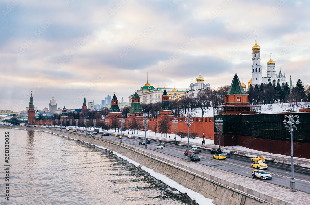 view of the Kremlin and the embankment of the Moscow river in winter, Moscow architecture