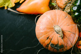 red pumpkins and peppers, a bunch of hay on a black background, autumn vegetables