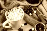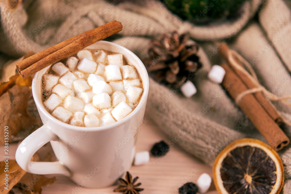 1 mug of hot chocolate with marshmallow and cinnamon stick, knitted sweater, dried orange slice, autumn,