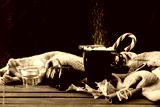 mug of hot chocolate with marshmallows and Lollipop, cinnamon, powdered sugar, candle, knitted sweater on a black background,