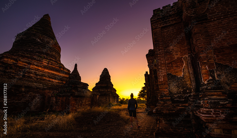 Bagan after Sunset Woman Visits old Temple Ruins