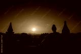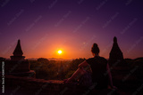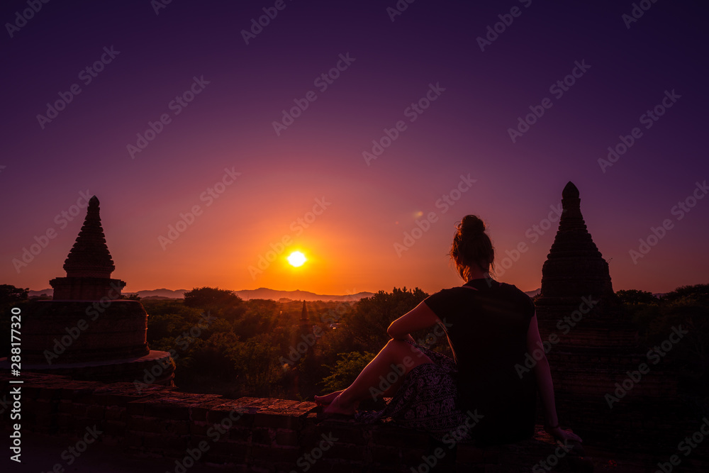 Tourist in Burma Woman admires beautiful Sunset over Pagodas in the City of Bagan Myanmar