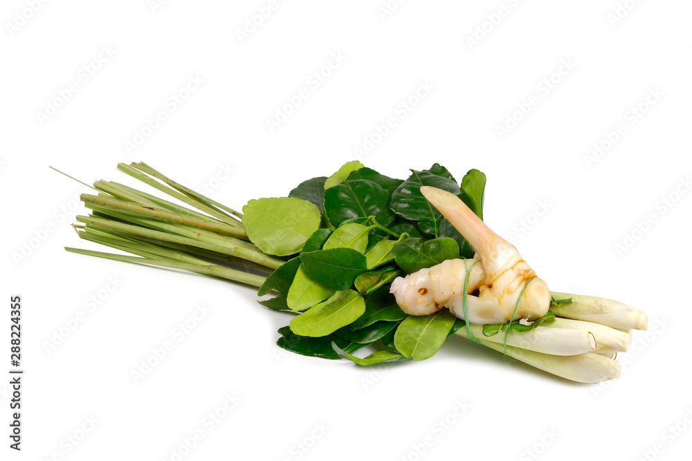 Kaffir lime leaf,lemon grass,Galangal isolated on white background