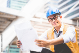 Handsome young asian man engineer or architect in a building construction site, engineering concept