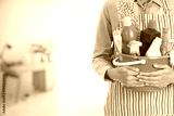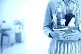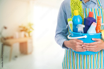 woman with cleaning equipment ready to clean house on living room blur background