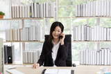 Asian business women in black suit who are happy talking Contact job by smart phone in the office. Network technology Communications concept