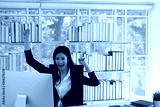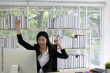 Happy businesswomman in black suit work at the computer screen. He Raising Hand Up celebration in success in desk at office building with natural light.