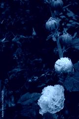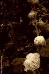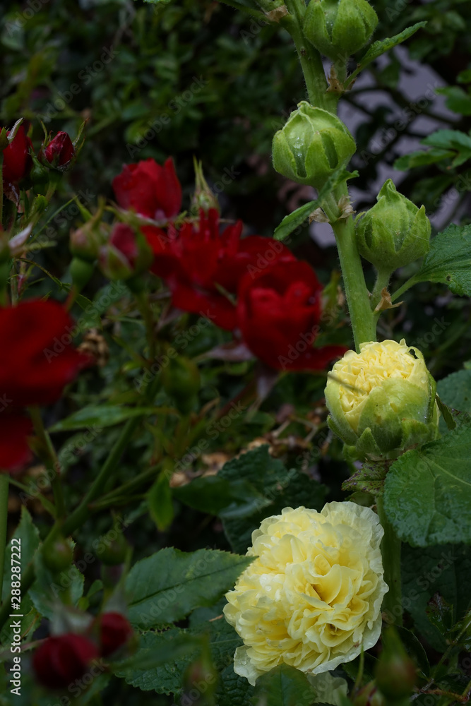 Żółta Malwa (Alcea) na tle czerwonych róż