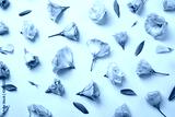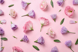 Flat lay composition with beautiful Eustoma flowers on pink background
