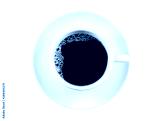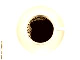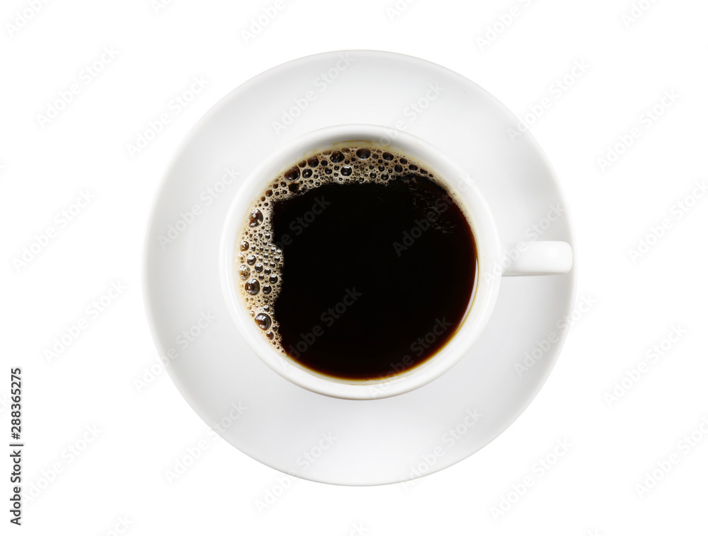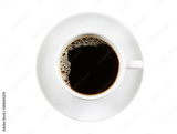 Black Coffee in white ceramic cup isolated on a white Background. Top view