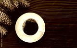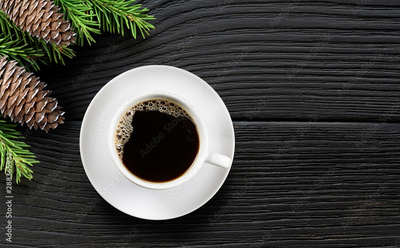 White Coffee cup and christmas tree branch with cones on black wooden background