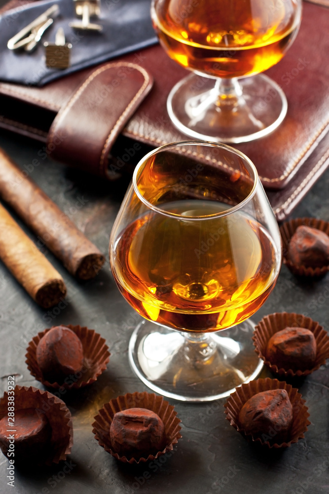 Glass of whiskey, chocolate truffles and cigar on dark table