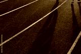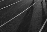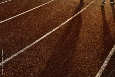 shadow of running people for exercise on the red and white line track floor of sport field in the morning sunrise background