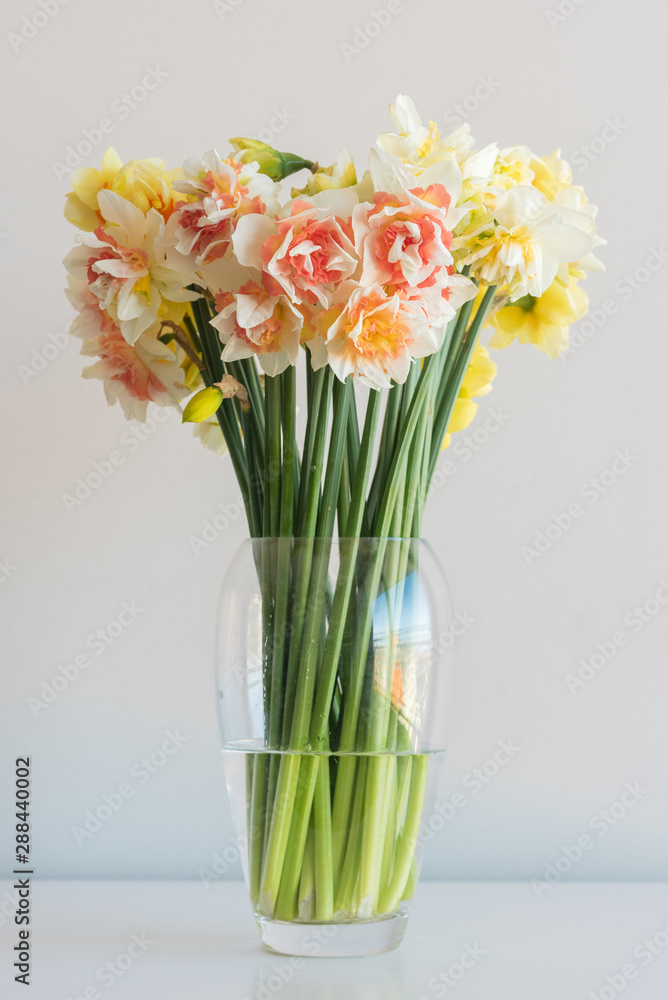 Vertical view of yellow and orange daffodils with green stems in glass vase on white table against neutral wall background (selective focus)