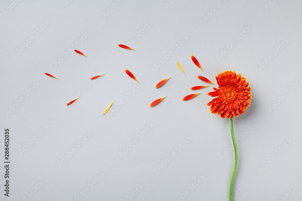 Beautiful orange gerbera flower with petals on gray background. Autumn windy day concept. Creative idea in flat lay style.