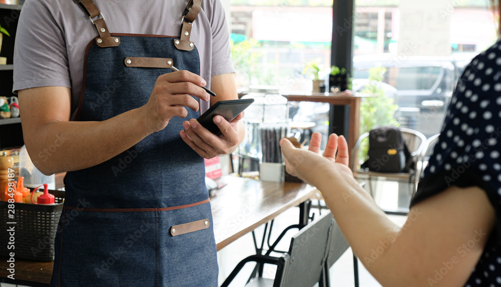 Employee holding a smartphone to save the menu the customer order.