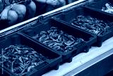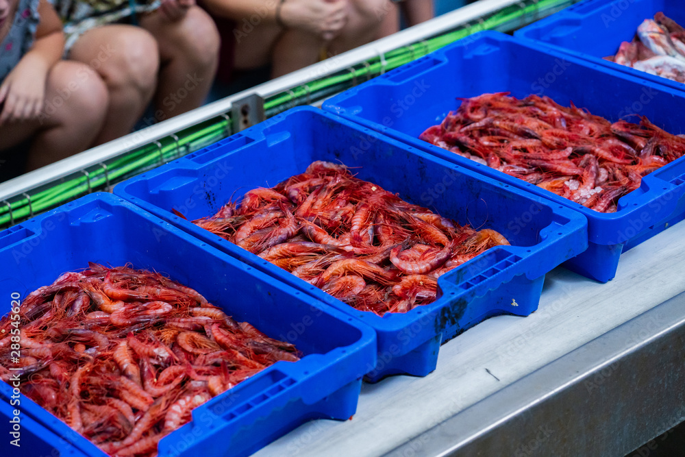 Close Up Fresh Red Shrimps or prawns on blue box in a Fishermen Market Store Shop.