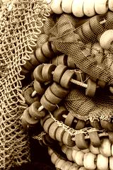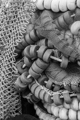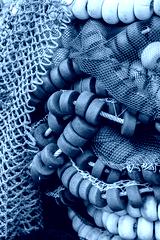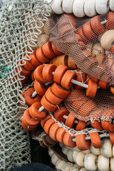 Marine networks Fishing equipment or rigging as texture background with natural light and shadow. Fishing nets and ropes for industrial fishing. Fishing nets and buoys tackle for professionals.