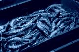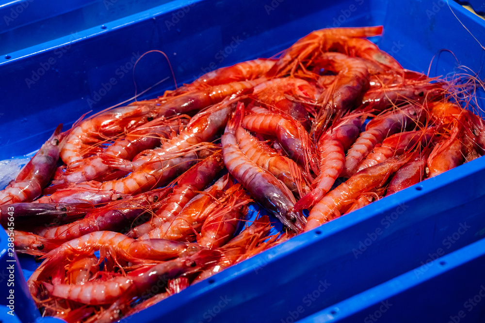 Close Up Fresh Red Shrimps or prawns on blue box in a Fishermen Market Store Shop.