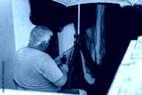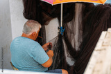 Needle with thread in fisherman hands repairing net for angling. Marine networks Fishing equipment or rigging as texture background with natural light and shadow.