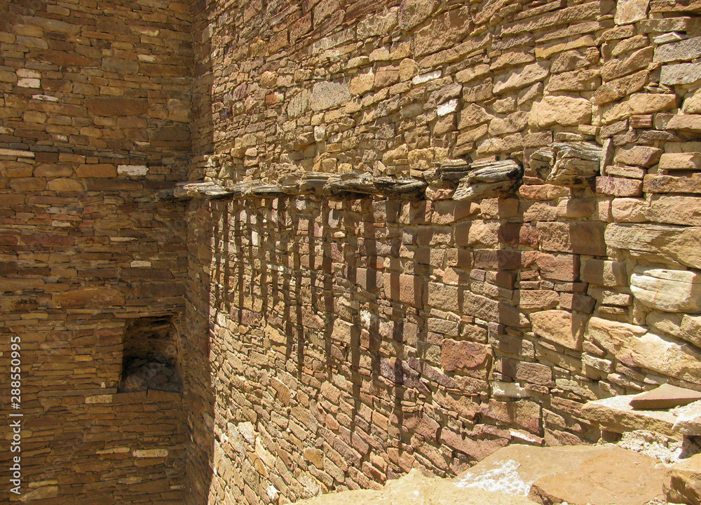 Wooden timbers called vigas protrude from an ancient stone wall in the ruins of Pueblo Bonito great house at Chaco Culture National Historical Park in central New Mexico, casting dramatic shadows.