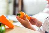 baby boy hands hold raw fresh red and yellow pepper indoor. baby exploring vegetables