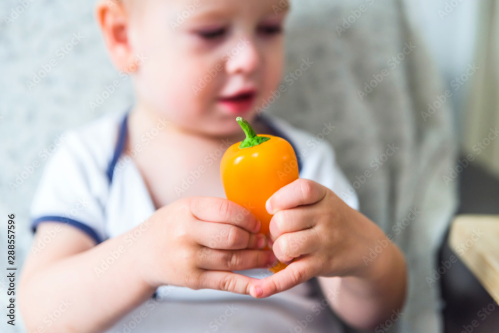 baby boy hands hold raw fresh red and yellow pepper indoor. baby exploring vegetables