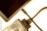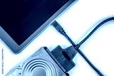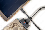 hdd 2.5 hard drive disk connected to digital tablet via sata usb cable closeup overhead view