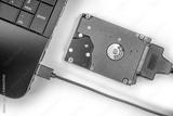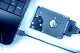 hdd 2.5 internal hard drive disk connected to laptop via sata usb cable closeup view
