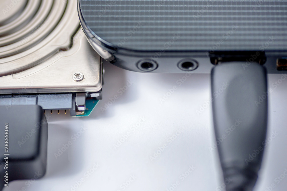 hdd 2.5 internal hard drive disk connected to laptop via sata usb cable closeup view
