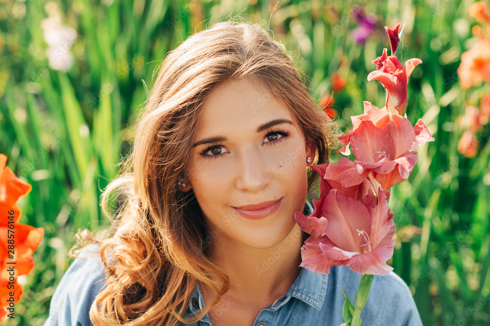 Outdoor close up portrait of beautiful young girl with gladiolus flower