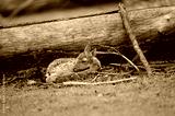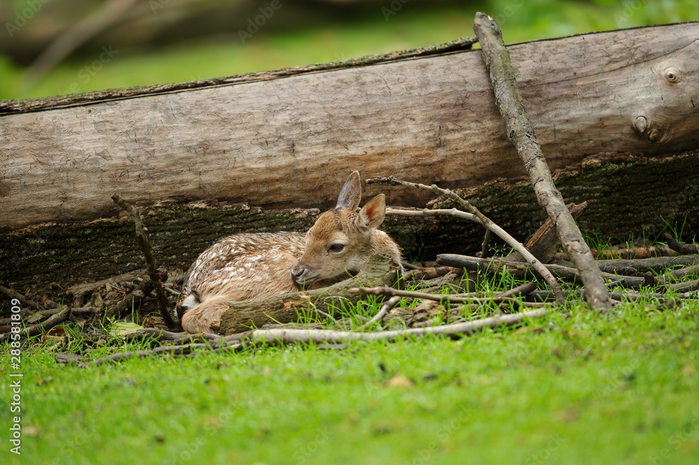 Newborn fallow deer fawn hidden close to the fallen tree