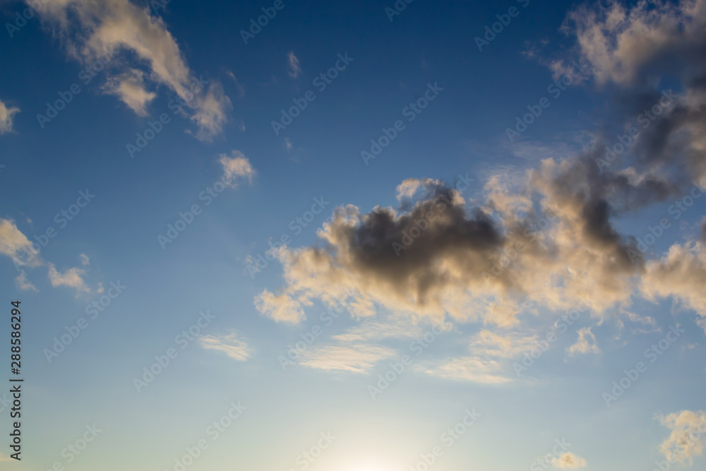 Colorful autumn sunset sky with sun rays coloring the clouds background