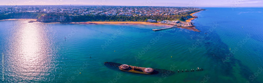 Historic shipwreck near Black Rock coastline in Melbourne, Australia - wide aerial panorama