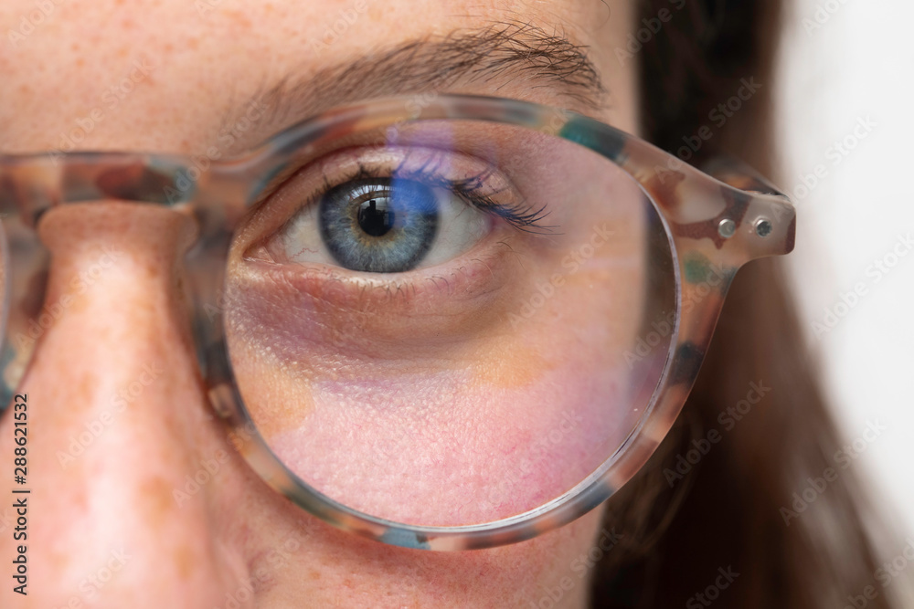 A beautiful young woman is seen up-close, wearing vintage eyeglasses as she looks straight into the camera, with copy space on the right.