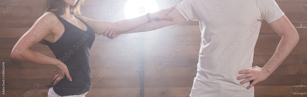 Salsa, kizomba and bachata close-up of dancers on wooden background. Social dance concept